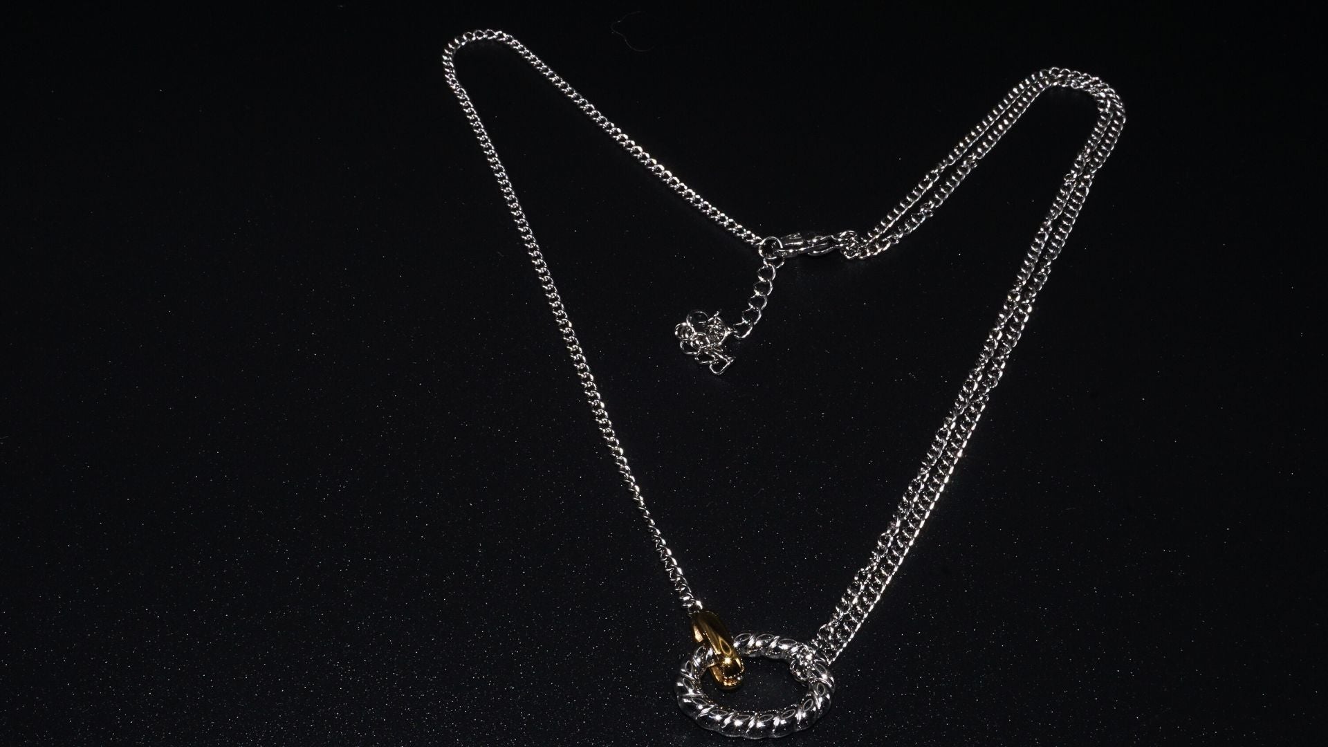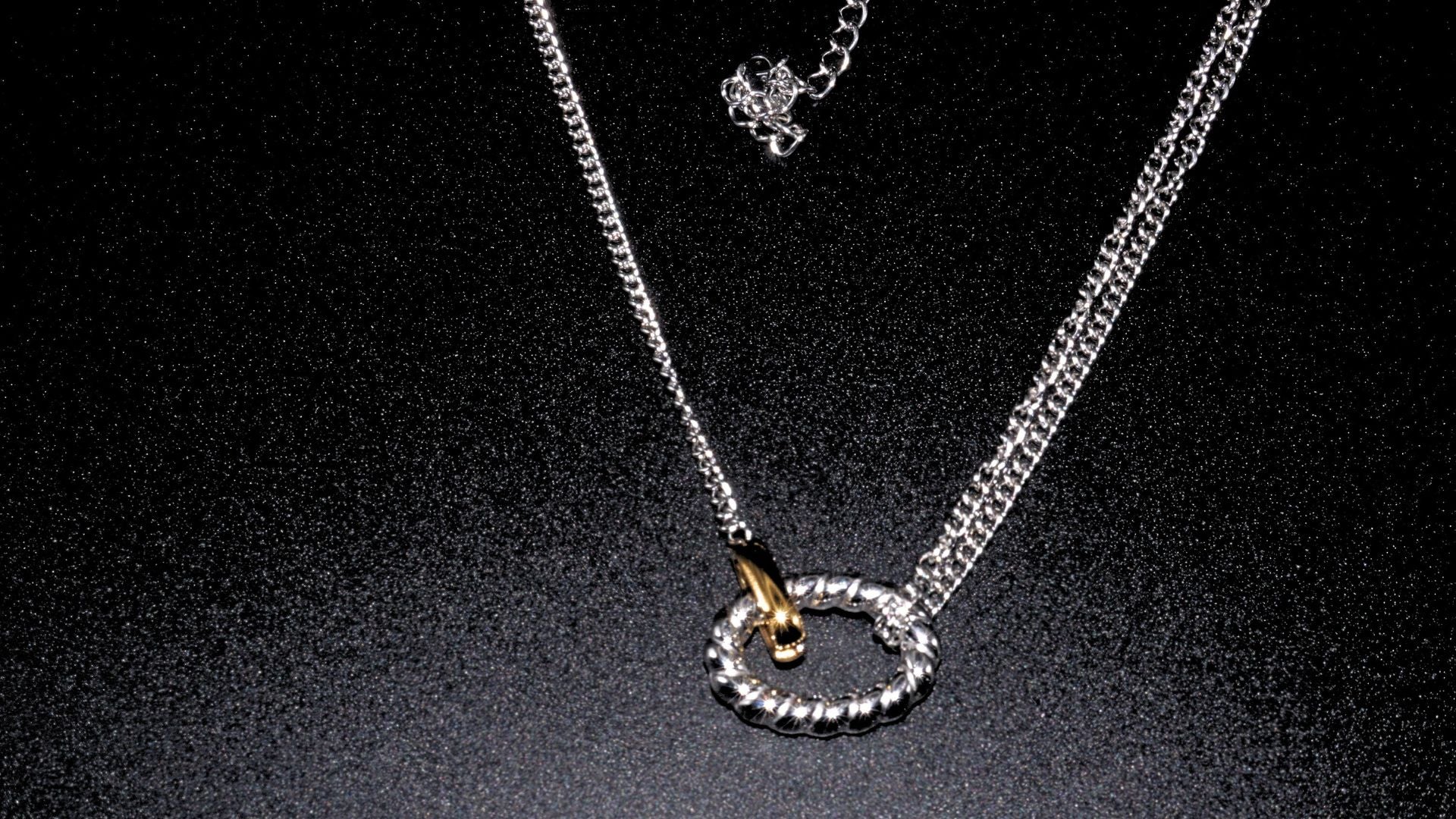 Twist up your style with this playful interlocked pendant necklace! The twisted pendant cleverly links into a shiny gold loop, creating an eye-catching focal point. One side flaunts a flirty double chain while the other keeps it simple with a single strand.