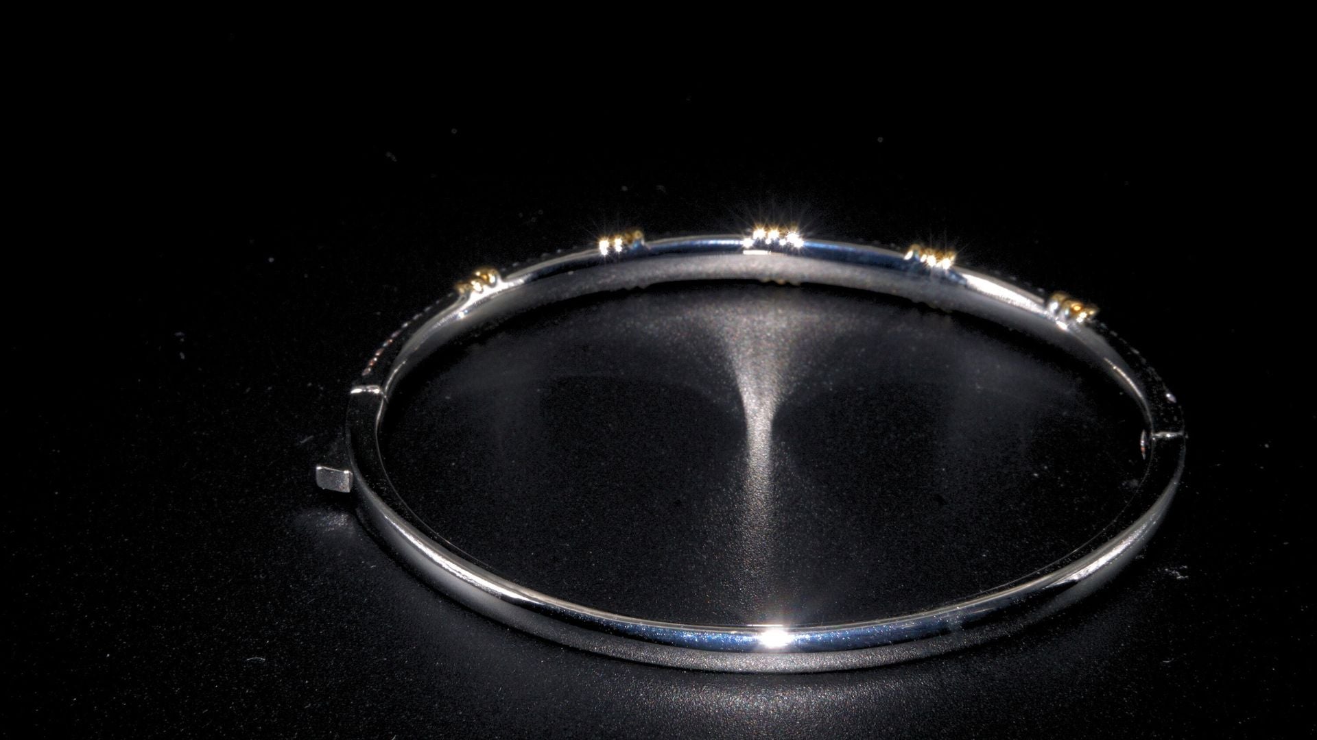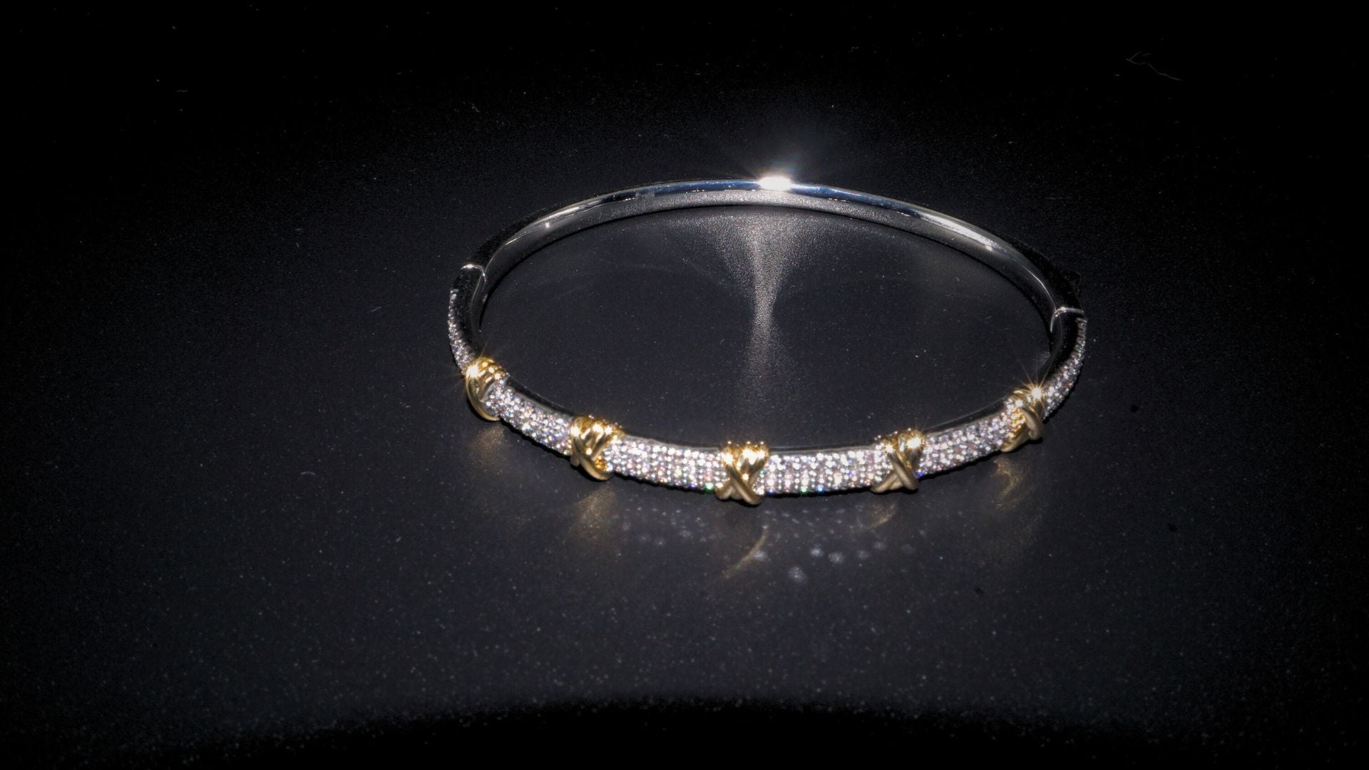 This precision-crafted bangle features a sophisticated dual-tone finish with meticulously placed rhinestones that catch the light with every movement. The secure interlocking clasp ensures comfortable all-day wear while maintaining a seamless aesthetic. Engineered with attention to detail, this statement piece balances eye-catching brilliance with practical wearability. The material is Brass with Cubic Zirconia stones.